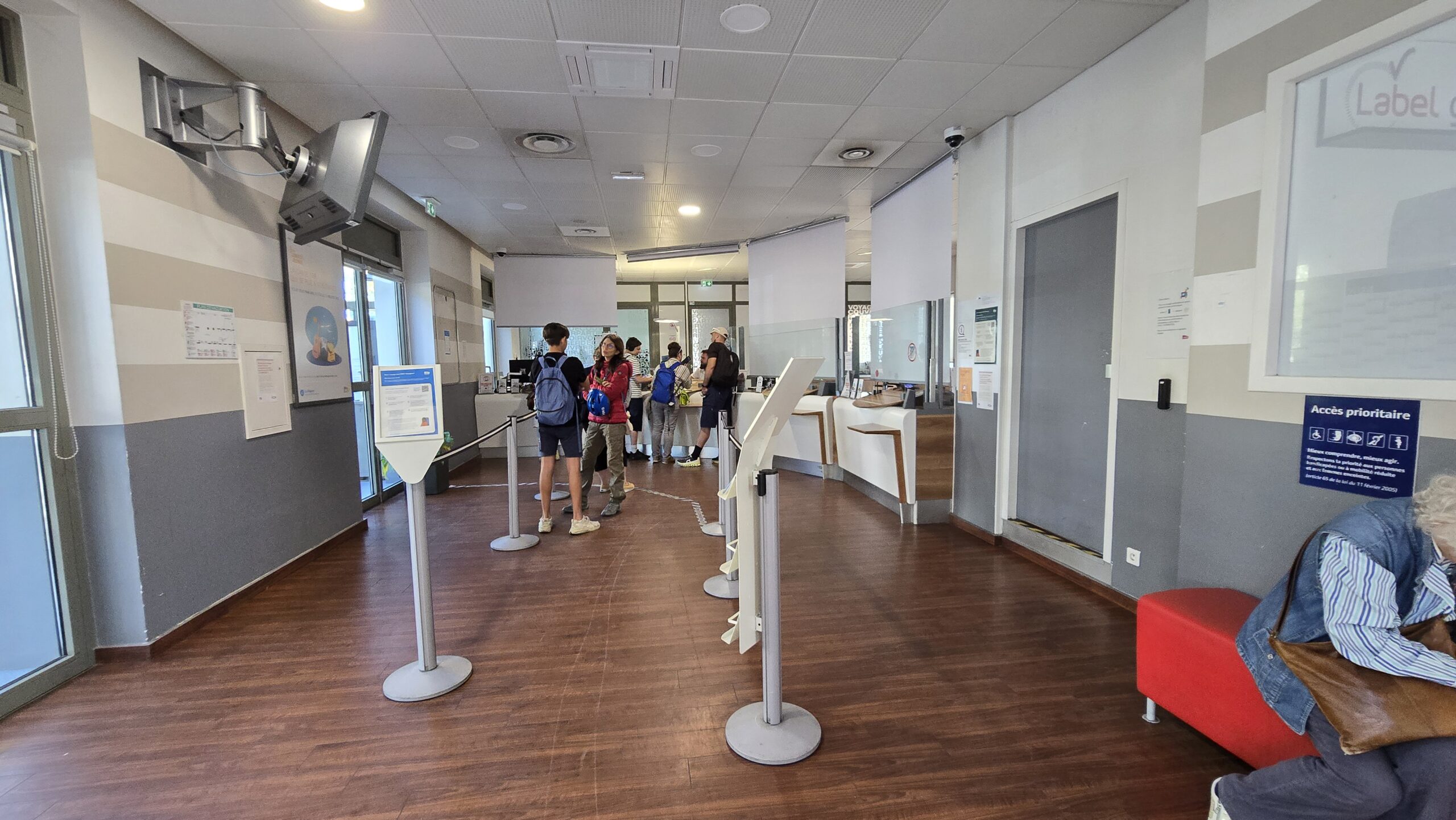 Signalétique et guidage : bandes podotactiles, balises sonores, boucles à induction magnétique pour malentendants.